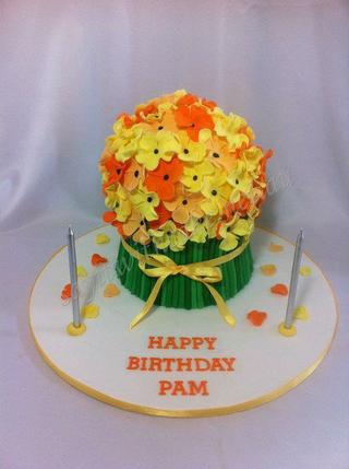 @halienka kopcek by som spravila tak zeby som hore ten korpus hrany zrezala do obla a potom tie zbytky korpusu s troskou kremu zmiesala - urobila puncovinu a totvarovala. vobec by som to nepotahovala ked tak ozaj len tenulinko aby nebolo vela hmoty. potom uz len po obvode sulky hmoty lepit a hore kvietky
