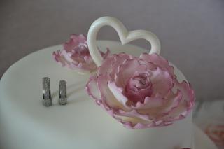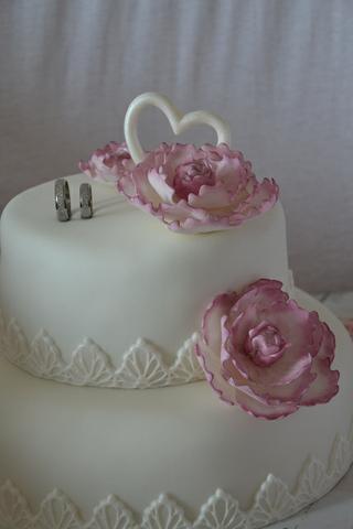 tak pridávam moju dnešnú... je to moja 10 torta v poradí, 4-tá na objednávku... podmienka boli obrúčky... a tetula čo si pre ňu nechala aj tringeltík... bola veľmi spokojná... 😵 ako to poteší taká pochvala... hmm... kvety boli trošku bledšie a s perleťou... aj tá krajka bola poprášená perleťou, len sa mi to nepodarilo zachytiť foťákom... 😠
