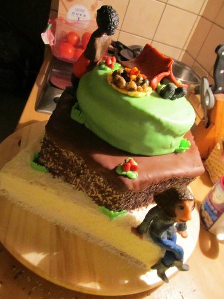 Ahojte, tak jsme dva dny po večerech tvořily s kamarádkou dort... Korpusy, náplně jsou moje práce, zdobení práce jedné kamarádky a postavičky jsou práce samotné autorky nápadu... Horní patro totálně nepovedené, pořád se mi to rozjíždělo, nešlo to zaboha srovnat a krém ne a ne tuhnout, asi málo másla...