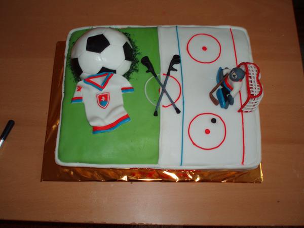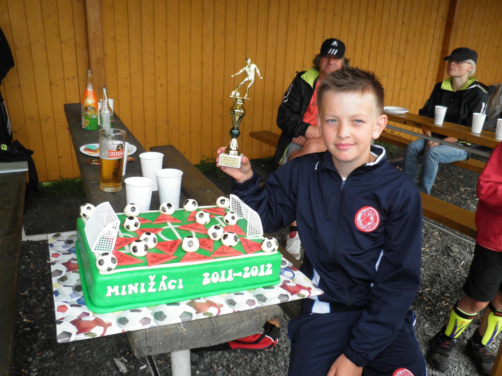 Holky byla jsem celkem v šoku, náš Maty měl ukončení fotbalové sezony a koupili jim dort dělaný u jedné paní. Vážil čtyři kila, potažený mléčným marcipánem, tři vrstvy těsta a dvě krém bez ovoce, branky chtěla vrátit a vzala si za to 500,- korun. Já to nechápu, to dělá úplně zadarmo. Fotka s naším Matym na ukázku, trochu zmokl, protože bylo škaredé počasí, tak byl takový mokrý. Měli to venku.