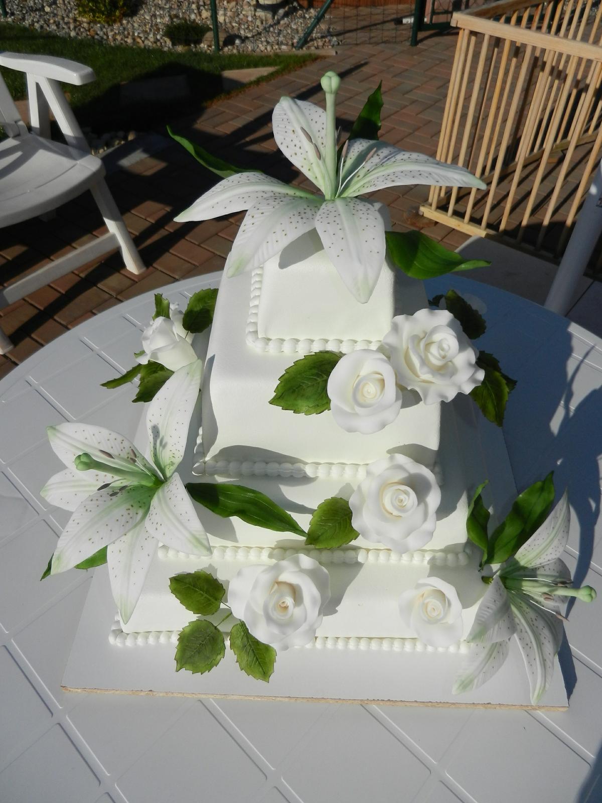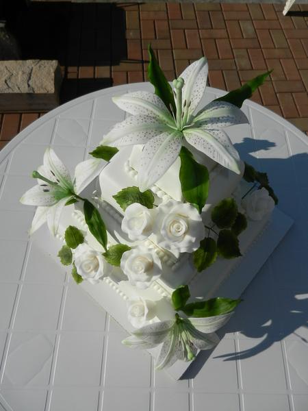 ahoj holky, všem moc díky za rady, nakonec jsem večer dodělala lístky růží a napíchala jsem je místo frézií, jak už jsem psala, požadavek byly bílé lilie a růže, takže ty jsem musela nechat, no a dopadlo to takhle, tak snad se bude líbit 😕