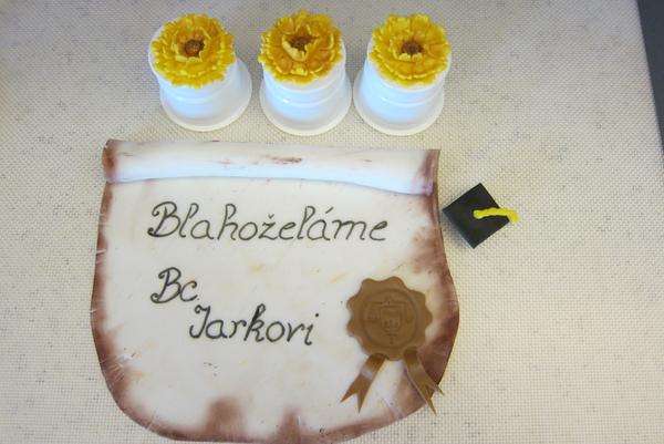 inak, ze ja neviem povedat nie...vcera vecer som este dala rychlovku ale len ozdoby, volala mi jedna starsia pani, mamina jednej baby co som im robila tortu, ze ona pecie pre nejaku jej kolegynu dobosku pre syna k promocii, a nevedia nic na ozdobu zohnat v obchode, co by sa hodilo, tak ma prosila, ze ak mam cas, ci by som nieco neurobila... tak pomedzi zvierata som cosi zbuchla, hadam to bude moct byt