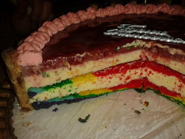 ...cez vikend som skusala duhovy tortu:D prvy krat,mala uspech aj na oko aj na chut...tvarohovy krem ,na vrchu maliny a zelatina...velmi svieze...odporucam duhovy korpus...