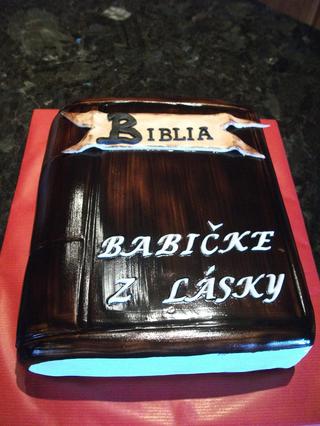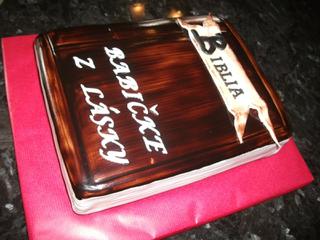 @sisa.b Ta biblia bola lahka..to som len naplnila platy,dala stuhnut,jeden bok som zrezala tak do obla,a potom som si kosticou naznacila akoze strany..po tych troch stranach,na tom oblejsom kraji som urobila iba take tri ryhy,ako viazanie a namalovala tym kakaom..len napis som mala trochu problem,lebo my to ani za pana nechcelo vyschnut..az na druy den bola sucha na povrchu a tak som tam vymyslela,ten napis-Biblia ako na takom listku...a to Babicke z lasky..som tam prikladala tak,ze som si kazde pismenko napichla na spendlik a sparadlom som to stiahla na tu tortu...no makacka to bola...ale aj mne sa pacila. 🙂