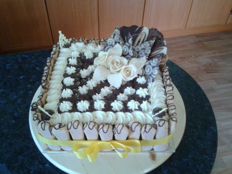 @levandulka3 no když pominu, že se mi tento styl teda vůbec nelíbí, tak myslím, že tu někdo psal, že čokoláda může na potahovku, že to nic neudělá /teda snad se nepletu/, tak si myslím, že by to šlo udělat celé z potahovky...tu hnědou i bílou část, včetně závoje...a na tu hnědou zdobení z čokolády a na tu bílou buď stencils či královskou glazuru.