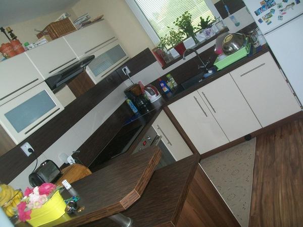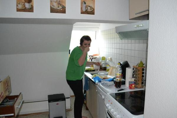 No myslim ,ze najmensiu mam ja na jednej skrinke som musela odsrobovat dvierka adat zaves aby som ju mohla pouzit tam celkom pod oknom a vdaka tym sikminam nemozem nikde nic strcit, ale zato hned za tou skrinkou so suflom su take malicke dvere vysoke asi 60-70cm a za nimi velikanske podkrovie,ktore mi sluzi ako spajza a mam tam vsetko mozne i nemozne.Vedla tej skrinky so suflom je malilinka chladnicka a mrazak. A ten nenazranec na fotke som ja . 😉 mala som navstevu zo slovenska 😀 Inac kuchyna je len taky lacak z ebayu, ako aj cely moj byt,kedze jedneho dna sa chcem vratit na slovensko a toto sa asi vsetko vyhodi,tak sa mi neoplatilo(a ani som na zaciatku nemala peniaze-vlastne ani teraz nemam 😲 😕 😝 )kupovat nejake extra triedy