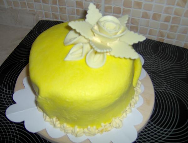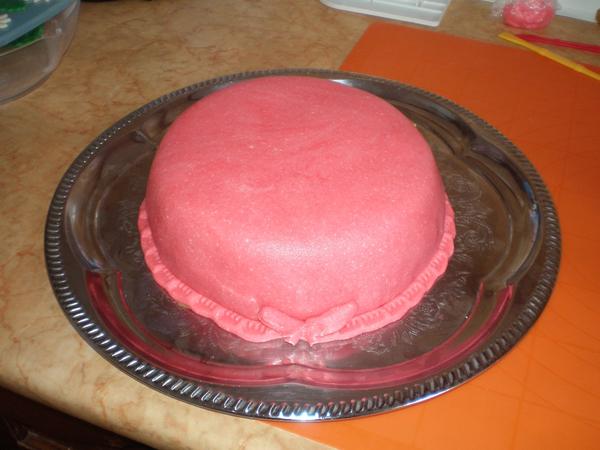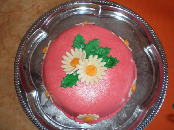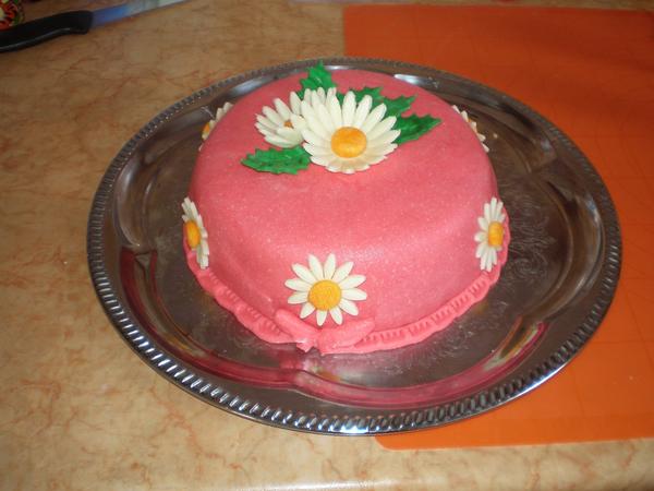 Ahoj, tak i já se dneska rozhodla upéct dort jen tak pro nás, je to korpus jen ze 2 vajec,takže jen takovej pidi dortík. Ráno v 7 jsem šla na to a ve 12 byl dortík potaženej. jen nahoře měly být 3 kytky, ale jedna nevydržela 😀 je to můj asi 9 dortík a poprvé se mi podařilo pěkně v celku potáhnout, asi tím, že byl malej 😉 😉 Ale stejně mám velkou radost 😀 😀