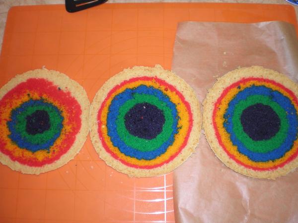 @blcha to mám inspiraci odtud, já si udělala těsto jako na mramorový korpus, ale bez kakaa. Pak jsem si dala 6 mističek do toho rozdělila těsto a obarvila, jen v první mističce bylo trochu víc těsta. Tu jsem dala na dno formy a pak postupně dávala ostatní barvy, ale vždy jen doprostřed . A takhle to dopadlo 😀