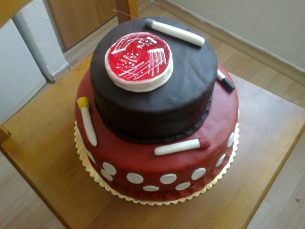 dnešní na rozlučku z kolegyní. Jsem laborantka na mikrobiologii, tak vše potřebné, klička,mikroby zkumavky 😀