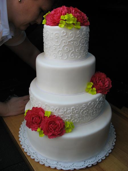 Ahojte kočky, tak som sa dostala k fotkám svadobnej torty, ktorú som vám spomínala, že robím v spolupráci s kamoškou, bez ktorej by som ju nemohla zrealizovať. Pre vysvetlenie - kamoška piekla, poťahovala. Ja som dala návrh na design torty a urobila som kvety a spolu s ňou sme ju naaranžovali. No a ako už viete, neviem cifrovať do boku, tak som využila zručnosť kamošky a mohla som si konečne splniť sen a mať tortu pocifrovanú slimáčikmi 🙂