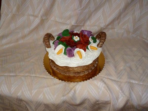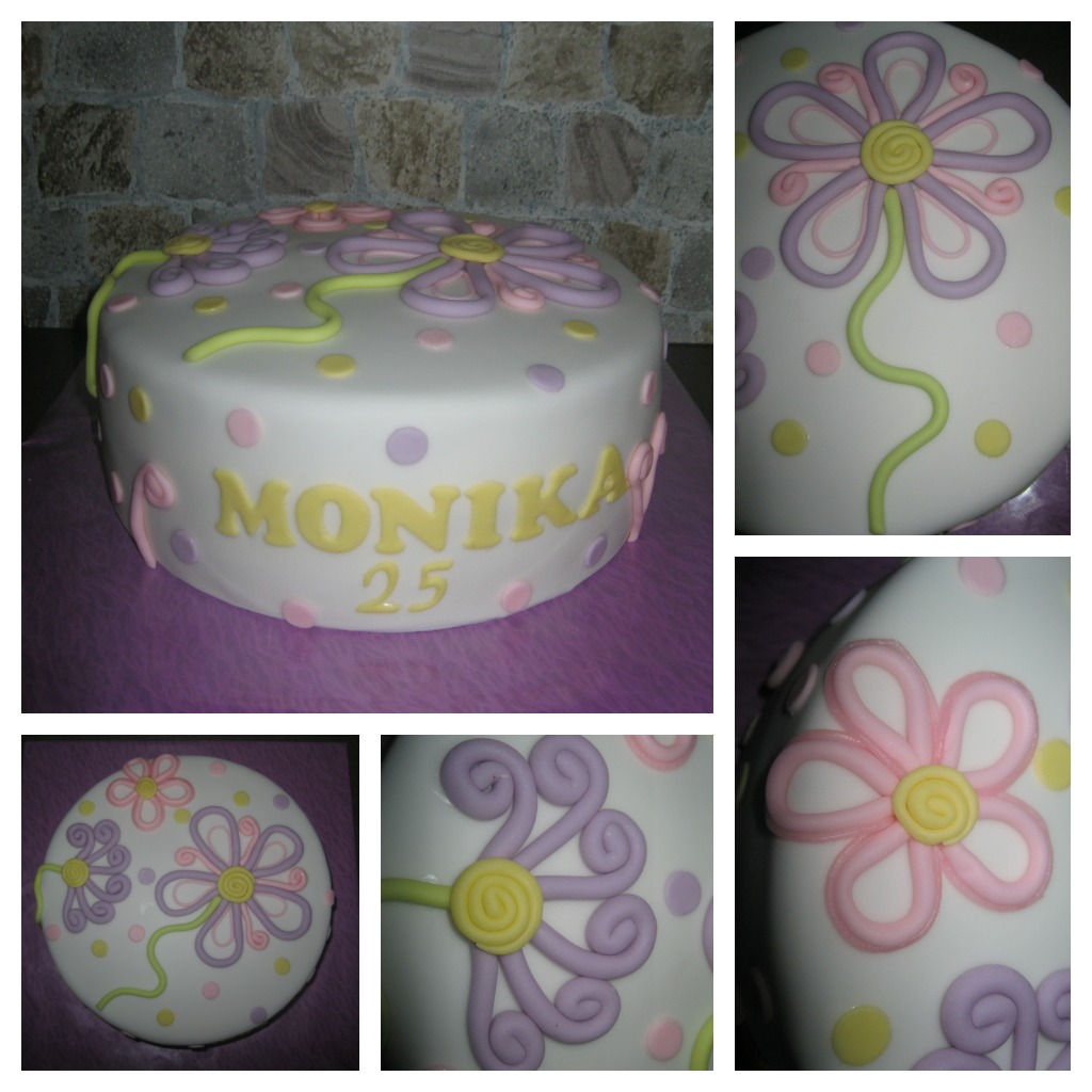Moja prvá poťahovaná. Ešte neviem aká bude, o jednej ju nesiem svokrovi, tak uvidím či sa podarila 🙂 Je to orechový korpus, pribináčikový krém s jahodami a z marshmallows, ale zdá sa mi tá hmota strašne sladká, nabudúce radšej skúsim falošný marcipán zo sušeného mlieka 😝