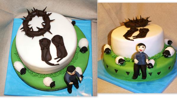 Tak můj posl.výtvor tohoto týdne - jsem ko. Tohle byla hurá akce, tatínek v 9 večer zavolal a dnes v 11 byl hotový. Bylo to pro našeho faráře k narozeninám, snad se mu líbil. Má nedostatky, ale už jsem to nedávala. Nahoře Bavaroise + čokokorpus, dole oříškový a karamelový krém (jeho milovaný :D ) Než jsem napekla koprusy a namazala - tak manžel udělal kněze a ovečky. Já ovečkám jen dodělala detaily a pak ta trnová koruna a kristusky už byla hračka.