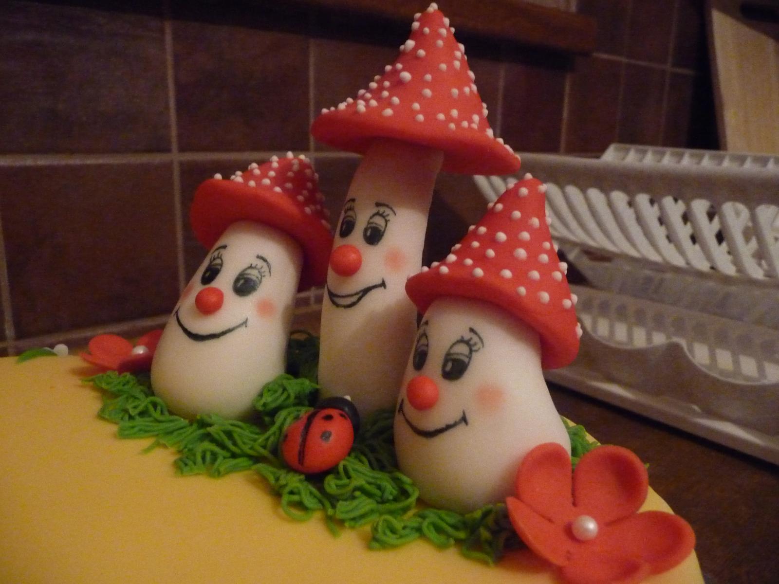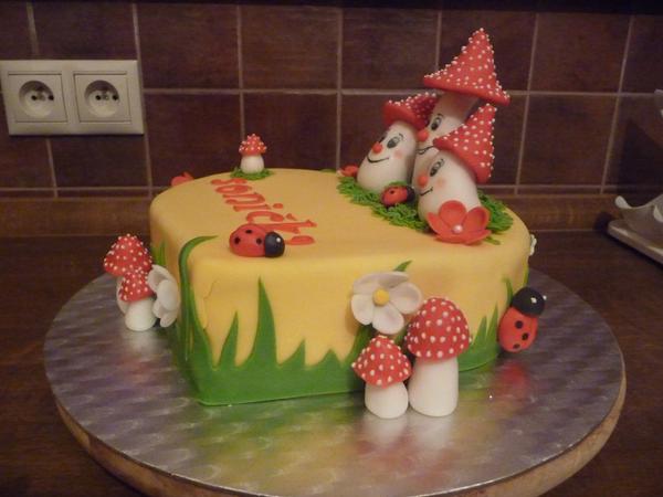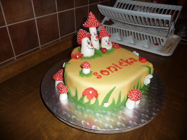 Babuľky, chcem sa vám poďakovať za rady ako namiešať čiernu farbu 😀 a pripájam 4-tú tortičku v histórii mojej tvorby pre moju dcérku k narodeninkám 🙂 Za veľké hríbiky som pichla tenučké sviečky, ktoré sfúkla, mala 3 rôčky 😵