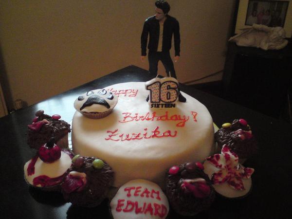 😀 😀 😀 😀 Co som nasla 😀 Dcera je Twilight manicaka {aj ja} tak chcela na narodky taku tortu. To je uz stara fotka ale myslela som po nej ze umriem 😀 zacala som to zdobit az ked som sa vratila s poobednej, no hroza ved to aj tak vyzera 😲 😲 😀 😀 a minuly rok som si pomohla s Edward babikou 😀 Inak tie muffinky akoze chlpate su vlci 😀 len aby ste vedeli.