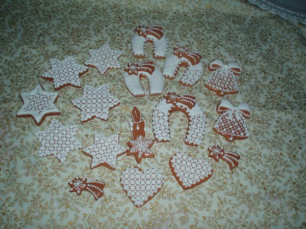 kocky my sme odisli uz v sobotu na sviatky prec tak som ani nestihla dat posledne medovnikove vytvory. nakoniec sa aj 3d gulky podarili aspon par a podarilo sa mi mat aj stromcek prevazne hand-made - iba pernicky a ozdoby zo slaneho cesta, pomaranc a samozrejme svetielka kupene. Tie pernicky isli na stromcek. A dalsia varka upecenych anjelickov pre radost 🙂