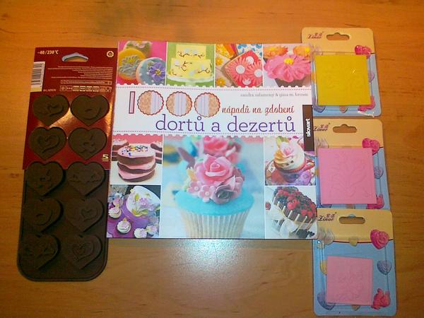 moj darcek od jeziska 😉 silikonka na coko, silikonky na potahovu hmotu od cinana po 2,30E, a kniha 1000 napadov na zdobenie tort a dezertov 😵 😵 😵