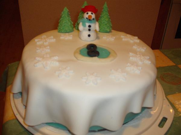 Doteraz mama piekla korpusy, naplnila a ja som len poliala čokoládou a ozdobila - stará klasika. Chcela som vyskúšať poťahovanú tortu a tu je výsledok. To isté nákladné auto, ktoré mal 5 krát a chcel ho znovu - des, som odmietla. Má rád sneh a keď som natrafila na vykrajovačky snehových vločiek, bolo rozhodnuté. Inšpirovala som sa najmä tu a som Vám vďačná za rady. Mramorovaný korpus, vanilkový krém a MMF a modelovacia hmota. Nešlo to podľa predstáv, ale toto z toho vyšlo. Prikladám aj chalúpku tiež moja prvotina - inšpirácia od Vás.