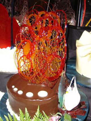 Nadulici, si obarvený karamel nalej na máslem vymaštěný plech a jakmile zatuhne, nakrájej ho ostrým nožem na kousky/polámej a pak navrš do tvaru ohně..🙂 Prostě ty ostré kousky o sebe opírej a udělej z nich oheň..🙂