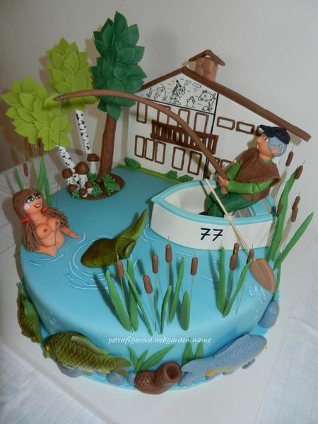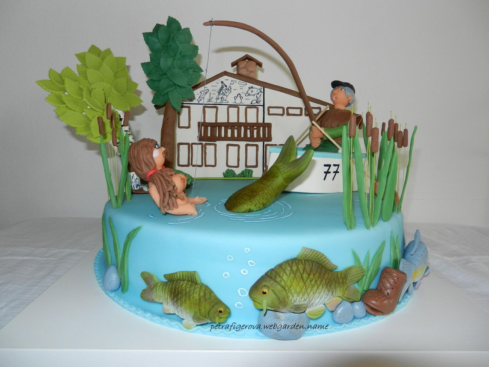 @jakelina holky, nevím, jestli není náhodou řeč o mně (nechci si teda fandit), já to tady vždycky tak jednou za dva dny prolítnu a jinak tady opravdu moc nejsem, ale dělala jsem tento rybářský dort, pro mého dědu k 77. narozkám. Ta budova je "rybárna", kde je děda skoro pořád, je obecní rybářský hospodář, to píšu jen kvůli tomu, že se mi tam moc nehodila, i jsem ji tam ani nechtěla dávat, ale dělala jsem ji přesně podle skutečnosti a děda byl fakt dojatý, že je na dortu všechno tak, jako doopravdy 😀 😉 .