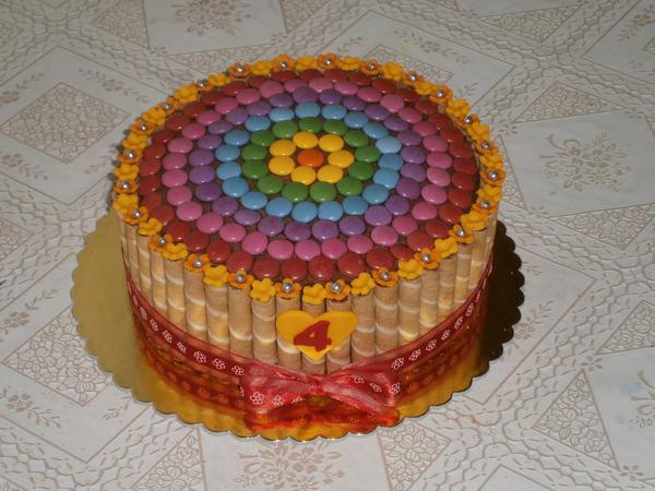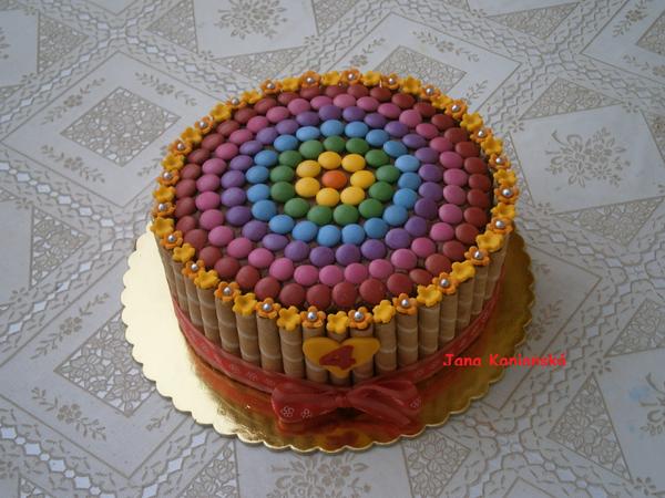 @jakelina jaj a zabudla som napisat, ze je to cokoladovy korpus, parizsky krem a banany...a okolo trubicky a hore lentilky a kvietky zo SV 😉 vaha 2,5 kg 😉
