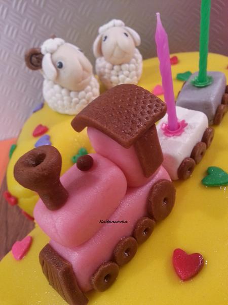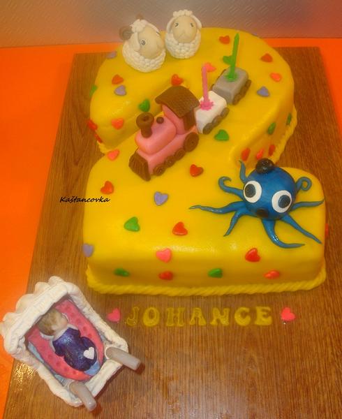 holky, přidávám dortík pro mou dcerku k 2.narozkám. Původně jsem chtěla dělat něco jiného, tématického, ale dcerka si sama řekla, že by na dortu chtěla chobotnici, ovečky, kočárek a mimi a mašinku. Se mi to k sobě nějak nehodilo, ale říkala jsem si no a co....dětské fantazie a přání se mají plnit....a radost byla obrovská!