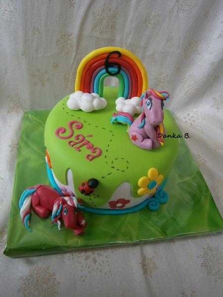 Torta cela kriva,hrbolata , no ako ked niekto sa uci robit torty , tak som jej ju urobila aby vyzerala k svetu,potah som nechala ,ale dala som dokola na celu vysku torty borduru s motylikmi a na vrch gulicky roznych farieb a pozapichovala do toho,, nadherne" ozdoby, ktore ani nedrzali , tak som jej tam dala este spajdle.