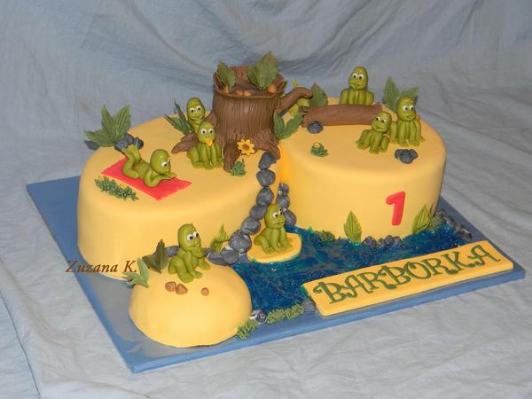 Ahojte, pridávam posledné tortičky, tú k 18-tke som mala presne nadiktovanú a nakreslenú, činku som dostala foto, ale aj tak som ju jemnúčko zmenila 😀. A zistila som, že nevieeem robiť žaby :(, no vyzerajú všelijak, len nie ako žaby, aj mi to dala moja milovaná rodinka komentármi typu - marťania, deti "Masky", malí fantomasy a podobne.