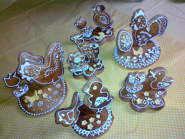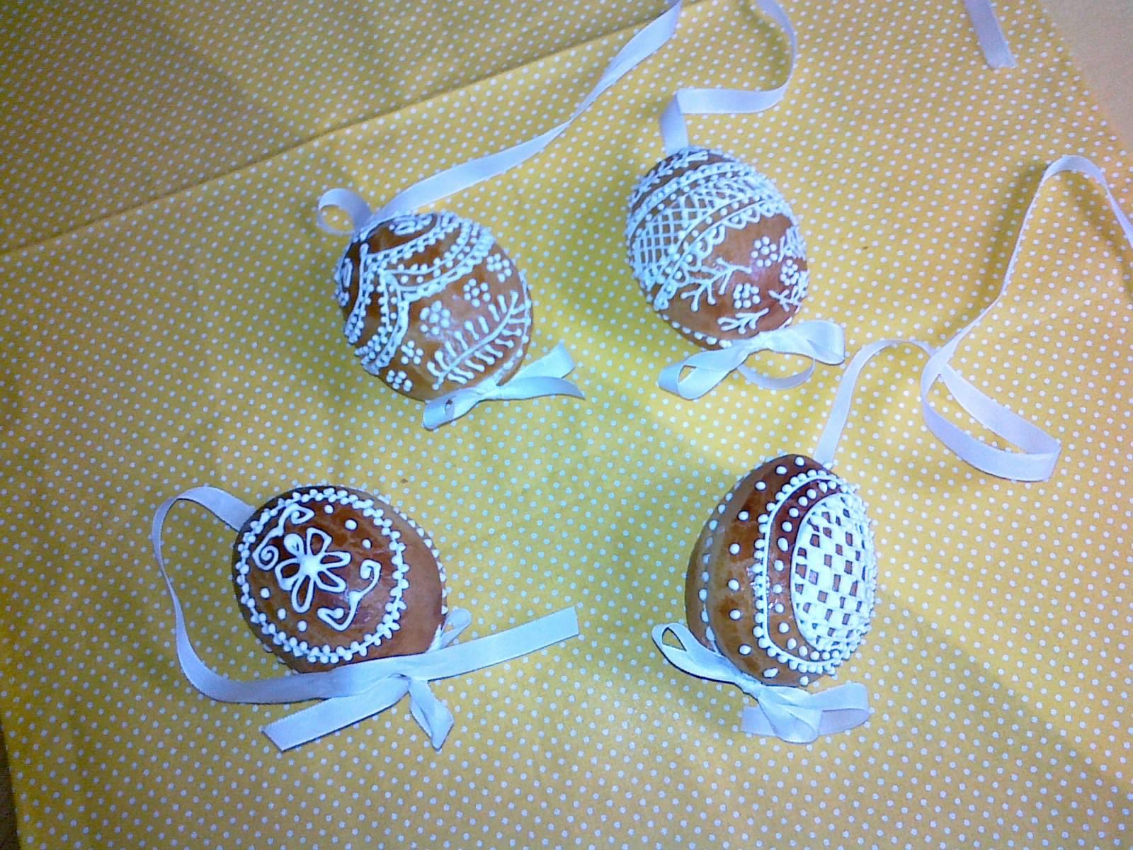 len tak par medovníčkov velkonocných, aj vajicka 3D maju chyby, ale pacia sa a podaril sa aj novy zltý bodkovaný obrus na stol tak mam radost 🙂