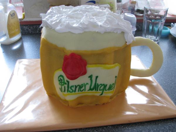 Tak přidávám svou víkendovku pro tchána. Není to tak krásné a bezchybné jako vaše dortíky, ale jsem pyšná, že jsem to vůbec zvládla. 😉 Ten tvar byl hrozný a hmota (mléčný marcipán) se mi nějak úplně nepodařila, měla jsem pocit, že se rozteče pod rukou, než to pivo dokola potáhnu. 😠 A kupodivu mi nejvíc času zabralo vytvoření té "pivní" barvy 😀 Tchánovi se moc líbil a všem moc chutnal, tak aspoň něco 🙂 Světlý korpus, krém paříž s mascarpone a superčoko pudinkový. Váha 3,5 kg.