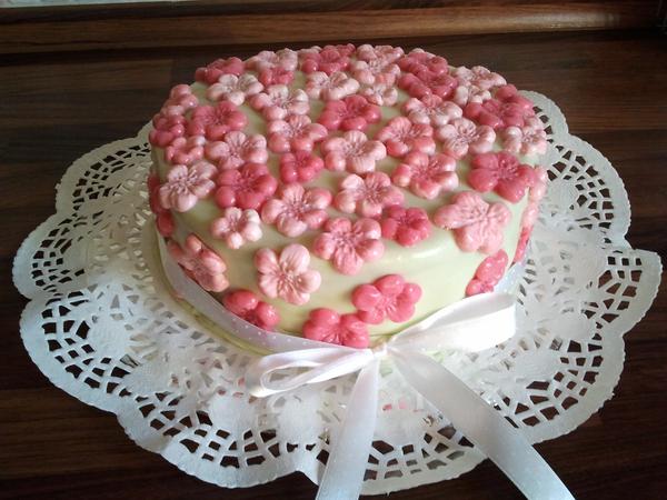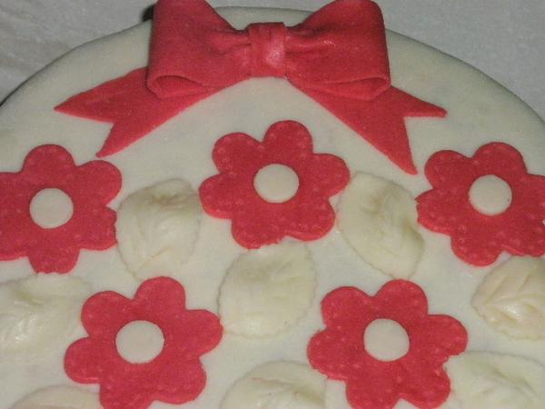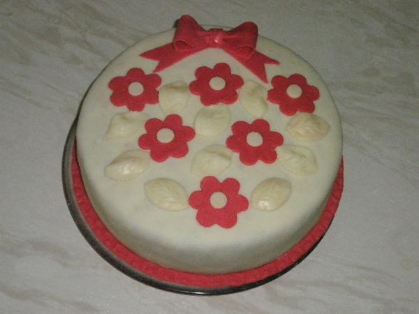 takže kočeny tu je moja prvotina ( akože vôbec prvá torta v živote! ) 😀 nič extra, ale nemám k dispozícií vôbec nič...teda žiadnu žehličku na marcipán, žiadneč vypichovačky dokonca ani farbu...jediná, čo doma bola - bola červená. No a formičky som použila kvietky na vianočné medovníky...
