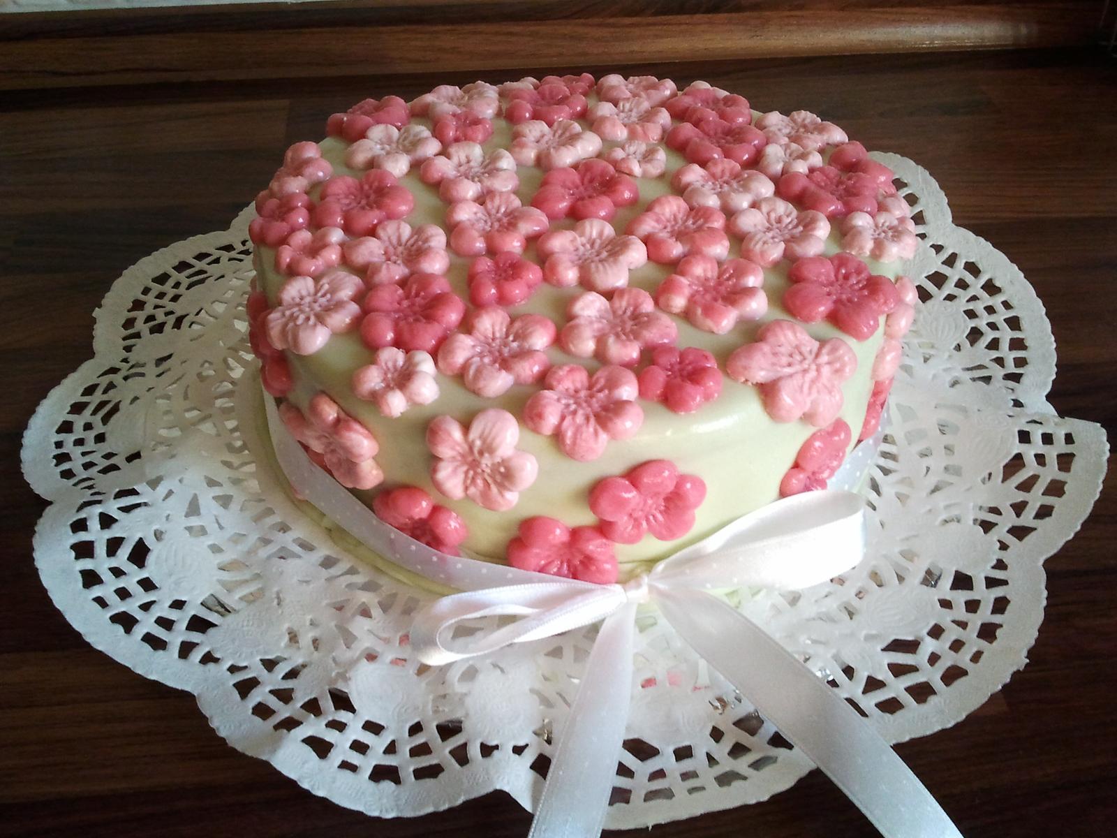 ahojte - dělala jsem babičce k narozeninam jen takový maličký s třešňovými květy. Vevnitř je vanilkový korpus s čokoládovým krémem prostřídaný s kakaovou roládou a tvarohovým krémem s banánem. Voní mi celá lednice..