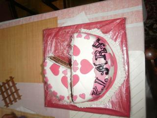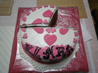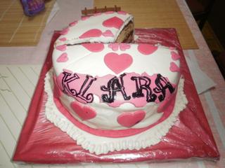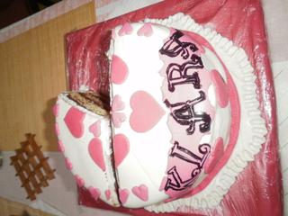 potom som si urobila hmotu varnu, ale ked som ju valkala a chcela prelozit na tortu, sa mi trhala vlastnou vahou, este ze som mala doma celofan, na ktorom som kajke k 2 rocku valkala torticku, tak som na nom rozvalkala apotom tak prelozila na tortu, neslo to uplne zahladit, takze je to mierne pokrcene napovrchu a potom som to len tak jednoducho zdobila srdieckami malymi a vlekymi a kedze mi neslo z tej varnej hmoty urobit z vypichovacky meno, tak som len tak vytlacila na vyvalkanu vyfarbenu hmotu a potom som to obkreslovala ciernou farbou, mne sa to moc nepaci, ale ked urobime fotky, hodim to tu...aj ked sa nemozem s vmai vobec porovnavat, ake ste sikulky cukrarky 😉