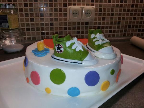 Ahoj holky!!!! Tak můj v pořadí již třetí dort je zdárně dokončen a zítra mohu předat mému bratranci a jeho manželce jako gratulaci k narození miminka 🙂 A myslím, že na to, že to byl můj první dort s tématem miminka a moje první botičky, že docela dobrý. Co myslíte?