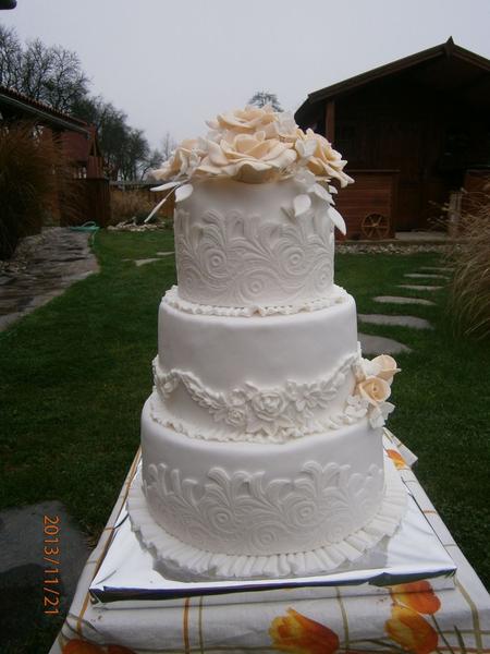 Tak aj ja ku Vašim dielkam niečo pridám.Svadobná 3 poschodka kôli ktorej som celý týždeň nemohla spávať,lebo cestovala 170 km a nevedela som ako dopadne prevoz ,bola úspešne prevezená .Torta bola úplne nalinajkovaná ,nemohla som zmeniť nič a tie ostatné kvietková môj výmysel a detské trošku obkukané ,nejak nemám tvorivého ducha.