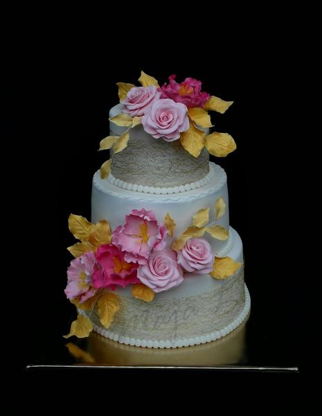 konecne na tento tyzden dobojovane, s minitortickami som tymto na dlho skoncila 😝 Tie listy vinica som nakoniec vyrezavala podla papierovej sablony, kurier mi volal az v piatok, ze vraj nestihal, tak som to ani neprebrala...Trojposchodka svadobna mala byt bielo-ruzovo-zlata, trochu kriklave zlte sa mi zdaju listky, ale hadam nevadi....este mam do vianoc par torticiek, ale uz menej, aj doma mi treba daco porobit 🙂