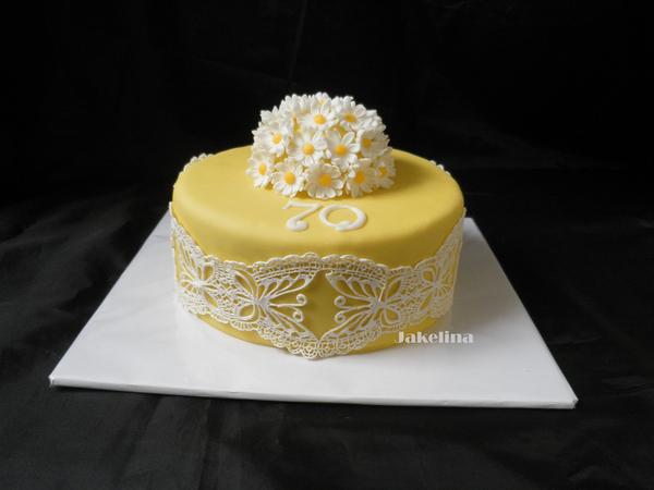Holky moje dnešní infarktová. Jsem doma, mám nějaký problém s počítačem v práci, tak jsem nešla do práce. Moje tchýně chtěla na zítřek malý dortík, jde přát nějaké kamarádce. Ráno ho potahuji a ona přijde, že se spletli a ta oslava je dnes. Tak já ani jednu kytičku, neměla jsem krajku ani nic. Prostě jenom potažený dort. Bylo deset hodin a pár minut a v 11.30 jsem měla na dortu dva pásy krajky, asi třicet kytiček a 70. Teď jsem si sedla zpocená jak myš. Mezitím tchýně s nějakou paní čekaly, až to dodělám. No moje nervy. Nevím co by dělala, kdybych byla v práci a dort si naplánovala udělat až večer jak přijdu. Na dortu to je i vidět, že je to šité rychlou jehlou, snad přežije cestu a bude se líbit. Jinak je fakt malinký, necelé dvě kila. 😒