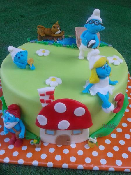 Bre ránko. Tak moje ďalšie víkendové. Na šmoulinku som sa tešila mala byť jednoduchá iba so šmoulinkou 🙂 no ,ale cez týždeň mi volali či sa dajú dorobiť šmolkovia a azrael,lebo dievčatko presne tých 5 tam chcela mať. Tak reku dá za príplatok,že nevadí,ale ona ich tam musí mať. 😝