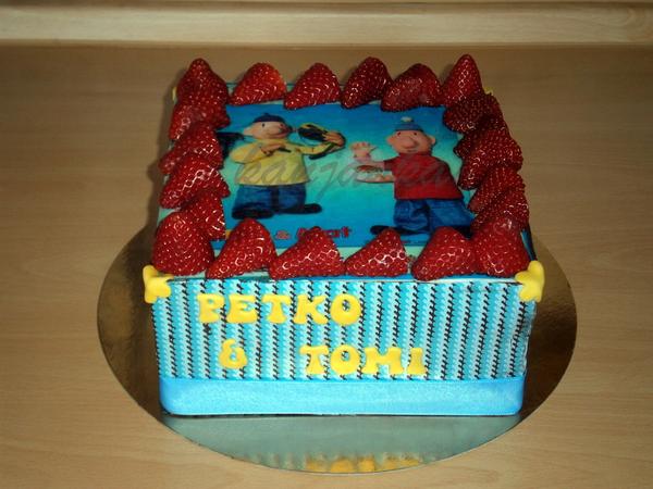 Konečne dobojované a myslím to doslovne,fakt to bol boj.Vôbec sa mi nedarilo ,niekedy mám také dni ,že nič sa mi nedarí,potom som nervózna a ledvác to dorobím a vtom zlom čase prišla ešte návšteva keď som robila TOMA a Jeryho,musela som to odložiť dorábala som v noci a v tom strese som zabudla nakolíkovať hlavu a dnes keď si došli pre tortu spodná časť total zvlnená,vidno to aj na fotkách,ale už nebol čas prerábať,lebo si prišli ráno pre tortu.No hrôza,ani sa nejdem viac rozčuľovať,idem s mladším synom hrať badminton na ukľudnenie.Čaute.