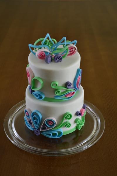 a este jedna narodeninova pre mna 😉 ....som skusala prvy krat quilling - no musim povedat ze vzor vyzeral lepsie 😀 😀 😀 skusala som to robit extruderom ale zda sa mi to moooooc hrube, lepsie by bolo lisom na cestoviny a narezat rezance 🙂 alebo rucne, bolo by to jemnejsie. @maya30 a ty to robis extruderom ci rucne? ale mozno aj preto ze torta je mini tak to posobi mohutne....