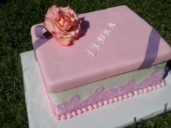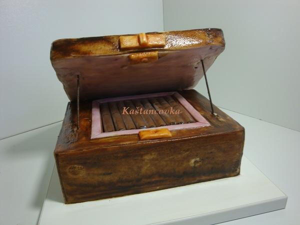 Ahoj holčičky, přidávám svůj nejkatastrofálnější dort. Normálně jsem se u něj rozbrečela. Povedlo se mi udělat super rovnou krabici i víko, jakože fakt, hrála jsem si s tím a měla z toho hroznou radost. Ale vůbec jsem nedomyslela tu konstrukci. Víko se sice nerozpadlo, ale bylo měkké, takže když jsem ho dala na dort, okamžitě projelo těmi špejlemi a prásklo sebou o ten dort. Pak jsem se ho snažila nějak upevnit a výsledek byl, že jsem si ho úplně rozmatlala, rozehřála, takže jak jsem ho různě chytala, tak jsem ho zrkoutila a výsledek byl, že to tam prostě nedrželo. Takže jsem se to snažila alespoň narychlo vyfotit. Ze spodu bylo víko krásně lehce růžové, na fotce je celé zapatlané, křivé a samá díra, jak jsem ho opakovaně propíchla. Zbortilo mi to i zadní stranu dortu, to jsem jakž takž zachránila a tak jsem to nakonec předala solo. Na fotce jsou i špinavé doutníky /ty jsou pravé, jako součást dárku/, ale byla jsem ráda, že jsem to vůbec nějak vyfotila. Bylo to pro taťku, takže žádný stres při předávce, ale mě to moc mrzelo, neb jsem se s tím předtím dost vyhrála a navíc mi na tom záleželo, taťka jde příští týden na velkou operaci a tak jsem ho chtěla trochu povzbudit. No ale aspoň chutnal a já budu přemýšlet, jak to udělat příště lépe.