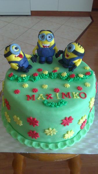 Prvá torta s mimoňmi bola biely korpus+pribin.krém+maliny a druhá čoko korpusy,mascarpone krém a malinky zo záhradky.