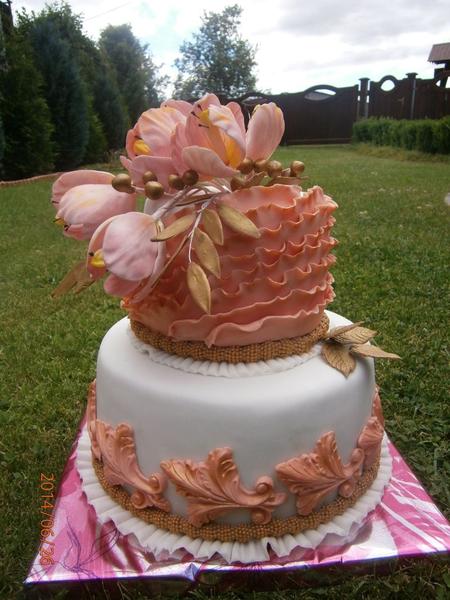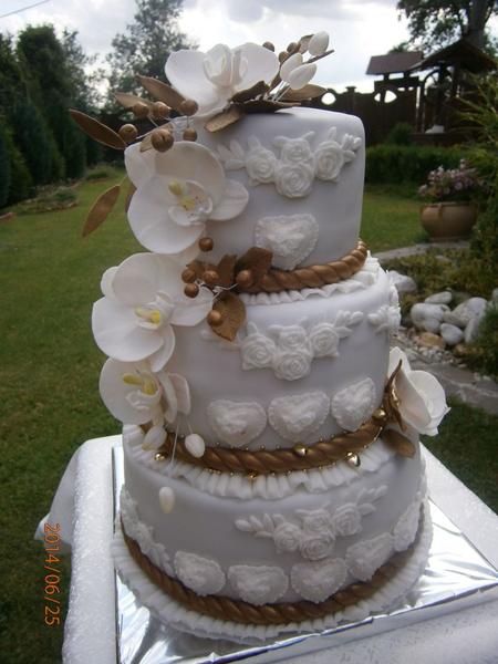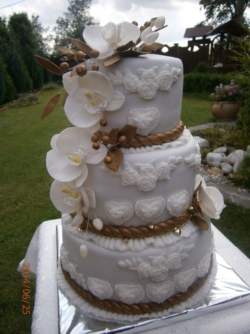 Už mám hotovo,lebo dnes veľa akcií zajtra zasa,tak som sa ponáhľala všetko ešte dnes dokončiť.Chalanom sme sľúbili za samé jednotky oslavu v reštike,to ideme o chviľku,potom máme disco na dedine koncoročné školské,zajtra veľká párty u kamarátky,tak máme čo robiť aby sme to pozvládali.Dievčatá moje zlaté,nemáte vyhliadnutú poriadnu zlatú farbu?Poskúšala som všetko možné striekala som zlatú ,potom práškovala,potom zmiešanú s alkoholom prachovú ,ale stále to nie je ono.Na fotke 3 poschodka mala byť zlaté doplnky ,ešte z blízka ako tak zlaté ,na fotke absolutne.,skôr hnedé ako zlaté a na bielom podklade som tiež skúšala ,ale to ešte väčšia hrôza.Na amerických tortách majú krásne zlatú farbu ,ale ja o takej u nás neviem.