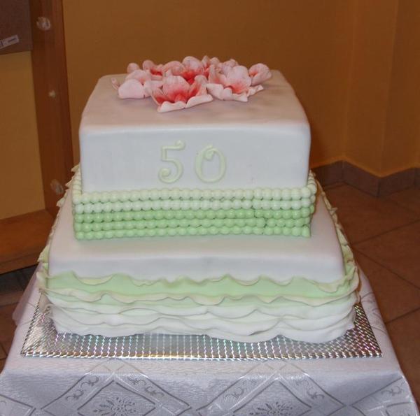 a tu je tá moja nešťastná torta, spodok kakaová piškóta, pribináčik s višňami, vrch orieškový korpus, karamelový krém, 9 kg..... jeden korpus sa mi pripiekol, do plnky som dala omylom viac masla ako som chcela, takže bola tuhšia ako som chcela, navyše ten orieškový korpus bol suchý, lebo som ho málo pokropila rumom, bála som sa, že to bude moc vlhké, kvety mi nechceli vyschnúť, no a poťahovanie, to bola nočná mora, preto má toľko perličiek a volánikov, aby som zamaskovala čo sa len dalo 😒
