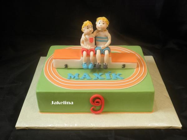 Já zase poskromnu můj jeden. Už mě to někdy otravuje, pořád někdo volá a chce dort a lidi nedokáží pochopit, že víc jak jeden za víkend nedělám. 😝 😝 Je to pro chlapečka co dělá atletiku a jeho mladší bráška v něm má vzor. Tak jsem to nějak takhle vymyslela, snad se bude líbit. Podmínka byla hranatý dort a nahoře ta dráha.