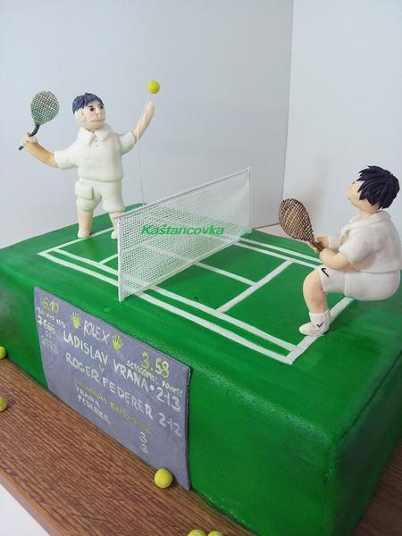 Já totiž dostala takové zadání, oslavenec musí podávat a Federer čekat na příjem. Dostala jsem fotky, jak to má vypadat. A taky dotaz, proč na jiných fotkách dortů (co si našli pro inspiraci) ty panáčci leží a nebo stojí s rovnýma nohama...no co na to říct, proč asi 😀....vůbec se mi do toho nechtělo. Když jsem řekla, že rakety (ten výplet) a síť budou nejedlé, taky se jim to moc nezdálo. Vysvětlovat, že na těch úžasných zahraničních dortech je půlka věcí nejedlých zbytečné....No vůbec se mi do toho nechtělo, ale přes všechny šílené požadavky při zadání, předání proběhlo perfektně, moc se jim dort líbil a vše už jen chválili, takže nakonec se mi ulevilo.....