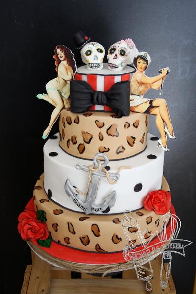 pridavam moju jednu z vikendoviek 🙂 dve torty som nefotila... jednu, pretoze som uz raz taku robila a druhu preto, pretoze som nestihla 😀 bola to trojposchodova svadobna a fotograf zo svadby mi slubil, ze ked bude mat hotove fotky, tak mi posle zopar s tortou odomna 😅 tak vam sem capnem aspon tuto jednu 😀 bola tiez svadobna 😅 taka na zelanie... nadiktovana 😀 mala byt v namornicko rockabilly style 😅 😀 😀 😀 ked prisli pre nu a videla som tich potetovanich suhajov, tak mi bolo hned jasne, ze preco takato trafena svadobna torta 😀 no a vlastne, preco nie??? 😅 😀 😀 😀