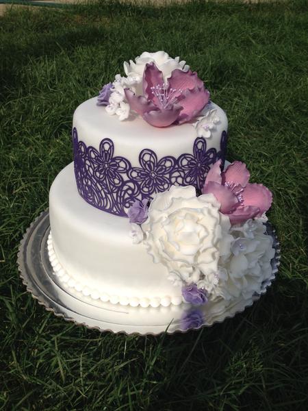 Tá prvá (zrejme svadobná) je prenádherná. A mohla by si mi prezradiť ako si robila na 1. poschodí tú fialovú bordúru? Je to otlačený vzor a obtiahnuté kráľovskou glazúrou, alebo úplne inak? Idem robiť svadobnú tortu synovi a práve takto dajako majú predstavu. Vopred ďakujem za pomoc