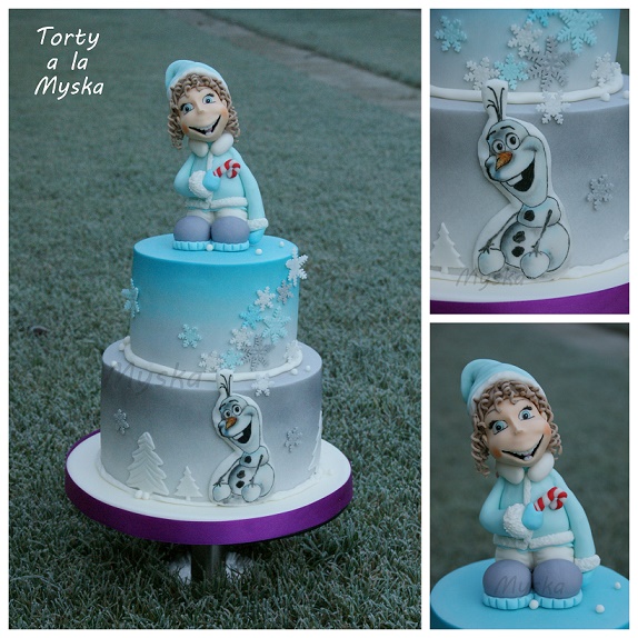 Ľudkovia,mne sa už tak nechce piecť. Budúci týždeň mám ešte 3 kúsky ,23.12. jednu a potom už aspoň 2 týždne nechcem torty ani vidieť. Dnes som piekla 2 dávky medovníkov a 2 dávky linecké keksíky a inak nemám nič viac napečené a ani sa mi nechce ☹ . Zimná torta objednaná v utorok večer,pani ma uprosila ,že jej na poslednú chvíľu nejaká iná pani 🙂 odvolala tortu a teraz sú bez. ,Ale zadanie ,že torta pre 3 oslávencov,no zbožňujem to najviac na svete a musia tam byť 3 postavičky.Od radosti som ani nevedela čo vymyslieť,tak keď je akože zima 🙂 tak zimná .A ešte som zabudla,obrázok na marcipáne nechcem už ani vidieť.Samozrejme zasa bubliny.poriadne potreté modecor gélom a aj tak zasa bubliny ☹ .