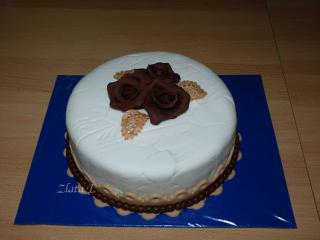 No a tu je moja tortička ... je úplne jednoduchá, ale to bol zámer. Ružičky a aj perličky na spodu sú z čokolády. skúšala som aj ozdobný maliarsky valček - moc to nevidno, blesk mi asi moc osvietil tortu
