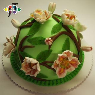 Nič ma nenapadá - uvažovala som nad ľaliou alebo orchideou, no neviem v akej farbe ich spraviť, aby to s tou zelenou pekne ladilo a nekričalo to